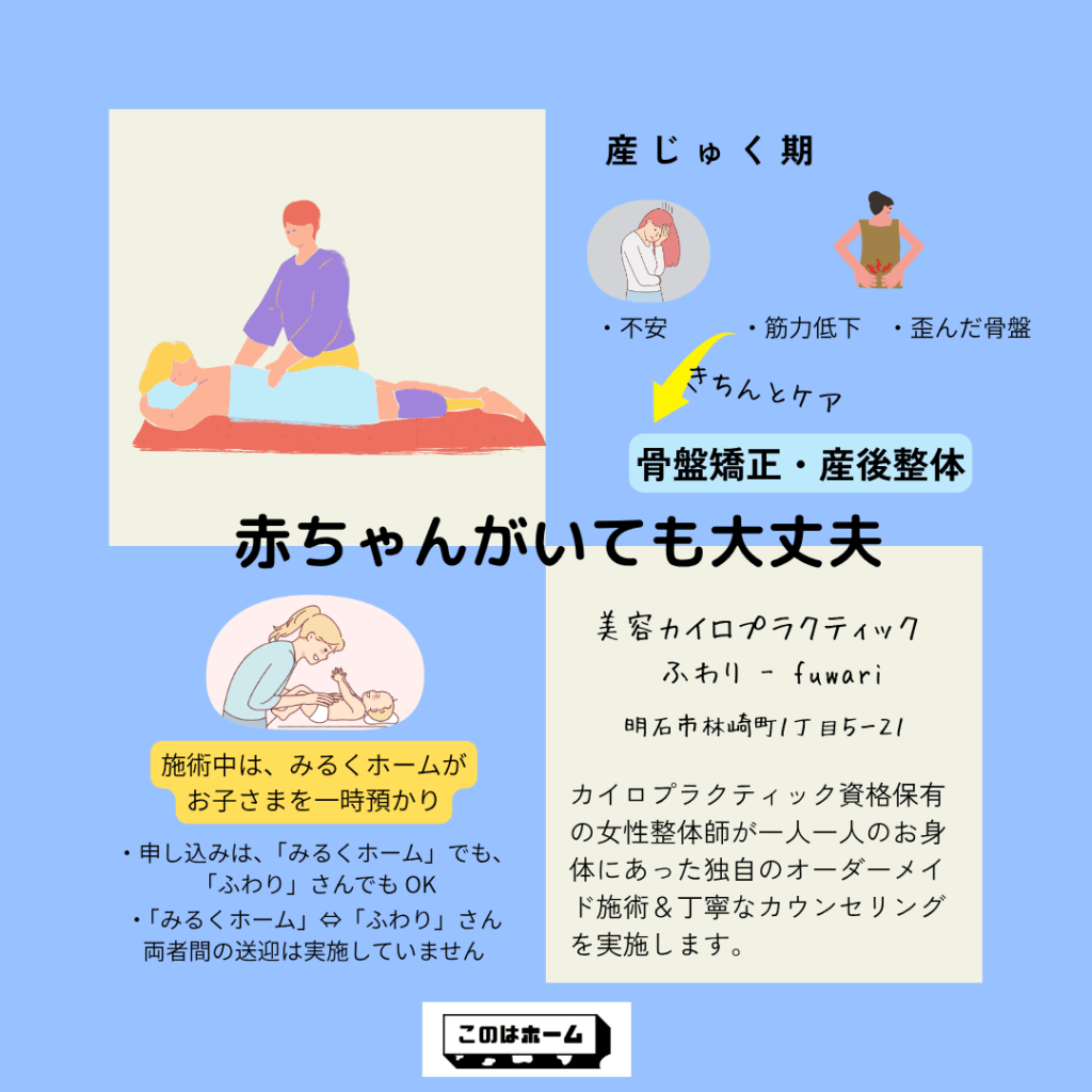 この度、産後ケアに係る取り組みに協力できないかと思い、明石市林崎町にある「美容カイロプラクティック ふわり~fuwari」さんと業務上の連携を図ることになりました。