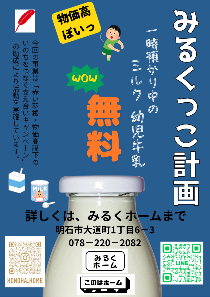 この度、「赤い羽根・物価高騰下のいのちをつなぐ支え合いキャンペーン」の助成を頂き、本園事業をご利用中のお子さまに、みるくの無料提供「みるくっこ計画」を実施しております。